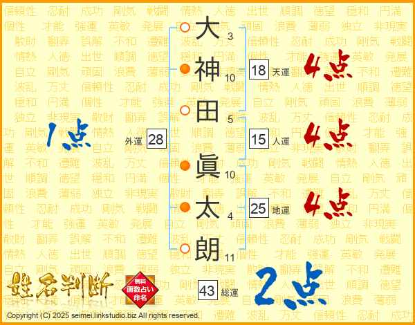 大(3画)神(10画)田(5画) 眞(10画)太(4画)朗(11画)