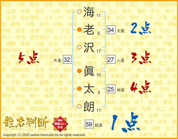 海(11画)老(6画)沢(17画) 眞(10画)太(4画)朗(11画)
