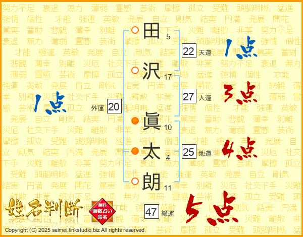 田(5画)沢(17画) 眞(10画)太(4画)朗(11画)