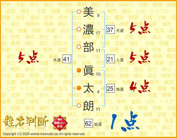 美(9画)濃(17画)部(11画) 眞(10画)太(4画)朗(11画)