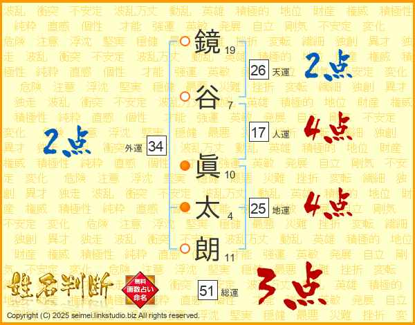 鏡(19画)谷(7画) 眞(10画)太(4画)朗(11画)