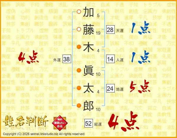 加(5画)藤(19画)木(4画) 眞(10画)太(4画)郎(10画)