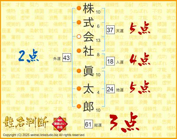 株(10画)式(6画)会(13画)社(8画) 眞(10画)太(4画)郎(10画)