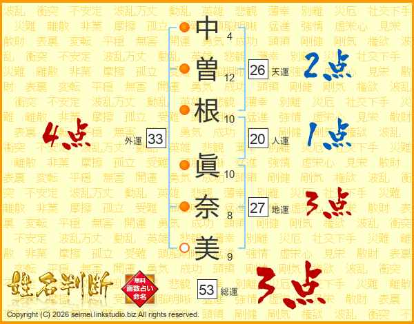 中(4画)曽(12画)根(10画) 眞(10画)奈(8画)美(9画)