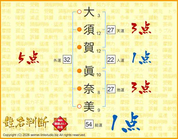 大(3画)須(12画)賀(12画) 眞(10画)奈(8画)美(9画)