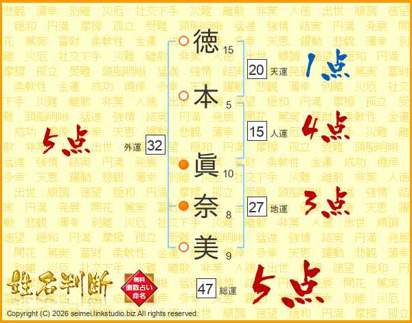 徳(15画)本(5画) 眞(10画)奈(8画)美(9画)