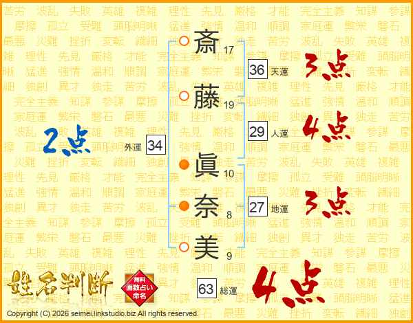 斎(17画)藤(19画) 眞(10画)奈(8画)美(9画)