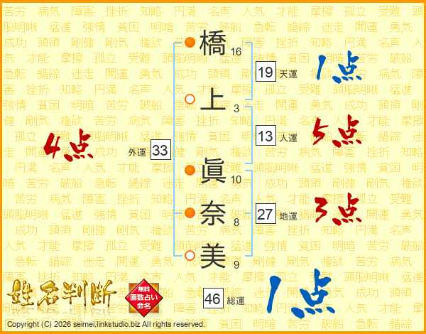 橋上眞奈美さんの総運は46画の1点!