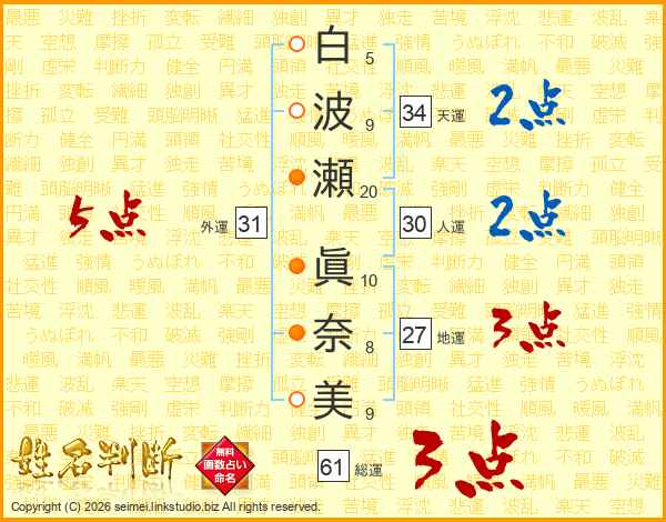 白(5画)波(9画)瀬(20画) 眞(10画)奈(8画)美(9画)