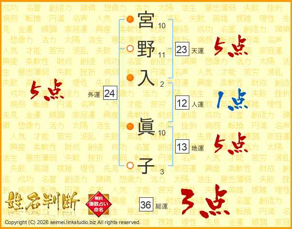 宮(10画)野(11画)入(2画) 眞(10画)子(3画)