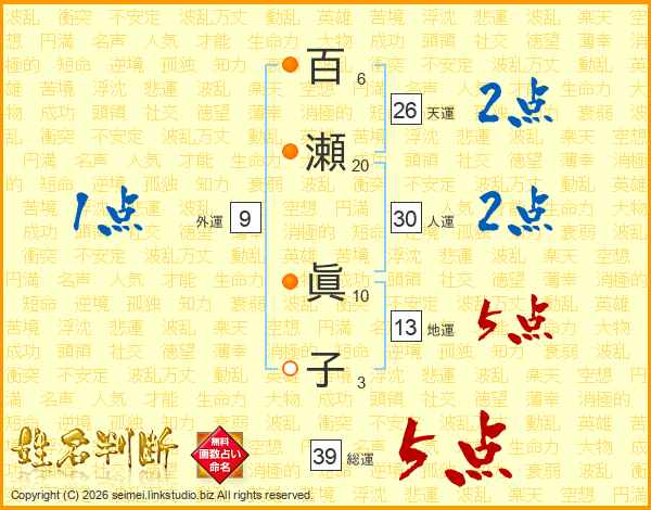 百瀬眞子さんの総運は39画の5点!