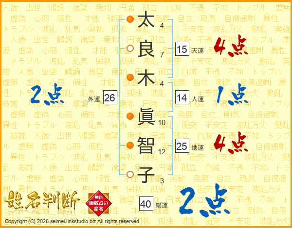 太(4画)良(7画)木(4画) 眞(10画)智(12画)子(3画)