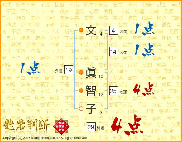文(4画) 眞(10画)智(12画)子(3画)