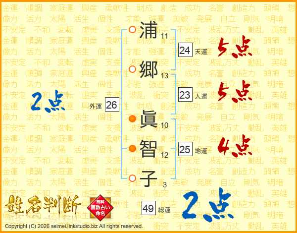 浦(11画)郷(13画) 眞(10画)智(12画)子(3画)