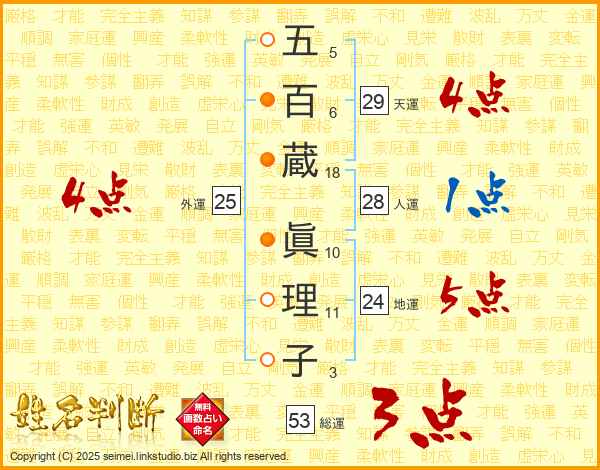 五(5画)百(6画)蔵(18画) 眞(10画)理(11画)子(3画)