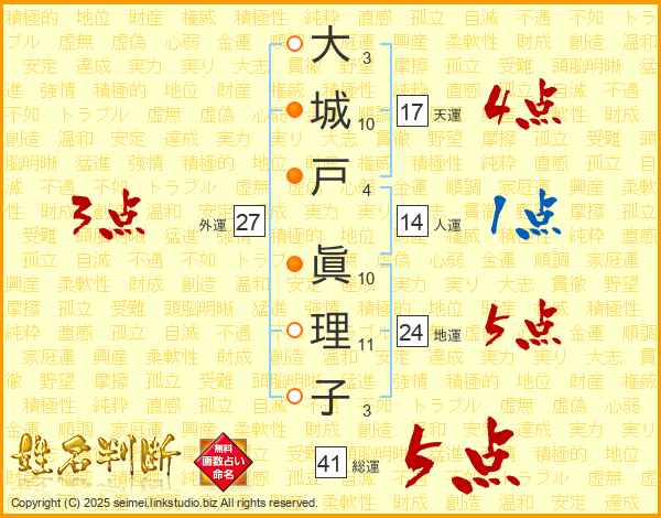 大(3画)城(10画)戸(4画) 眞(10画)理(11画)子(3画)