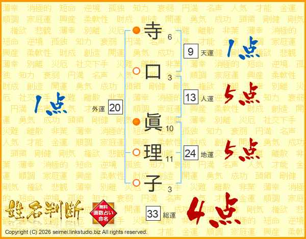 寺(6画)口(3画) 眞(10画)理(11画)子(3画)
