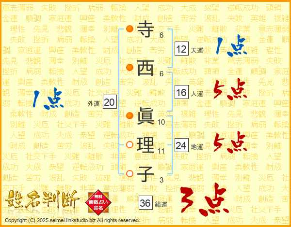 寺(6画)西(6画) 眞(10画)理(11画)子(3画)