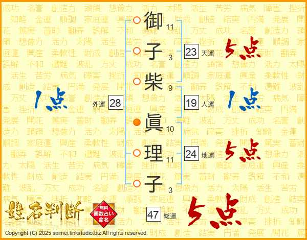 御(11画)子(3画)柴(9画) 眞(10画)理(11画)子(3画)