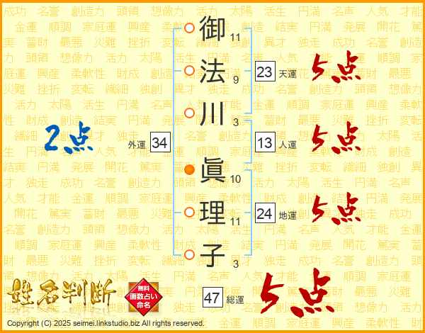 御(11画)法(9画)川(3画) 眞(10画)理(11画)子(3画)