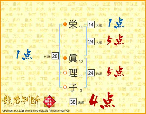 栄(14画) 眞(10画)理(11画)子(3画)