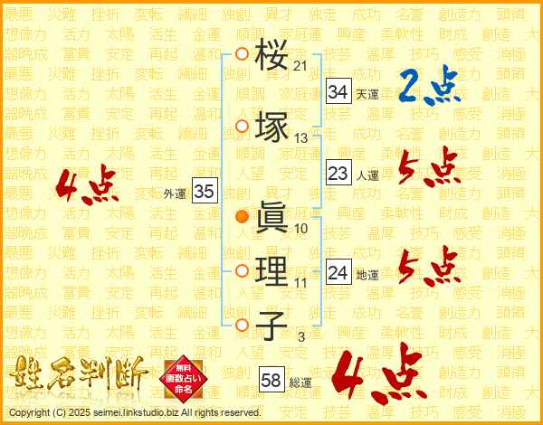 桜(21画)塚(13画) 眞(10画)理(11画)子(3画)