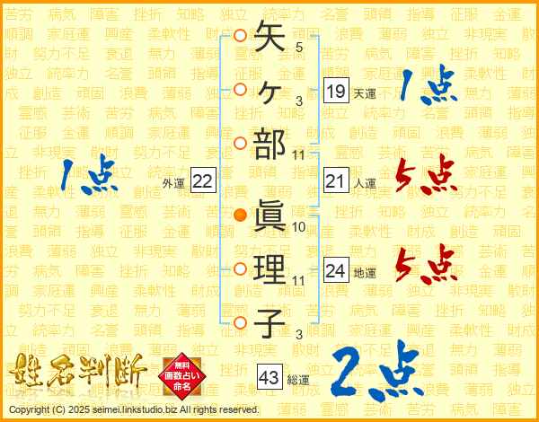矢(5画)ヶ(3画)部(11画) 眞(10画)理(11画)子(3画)