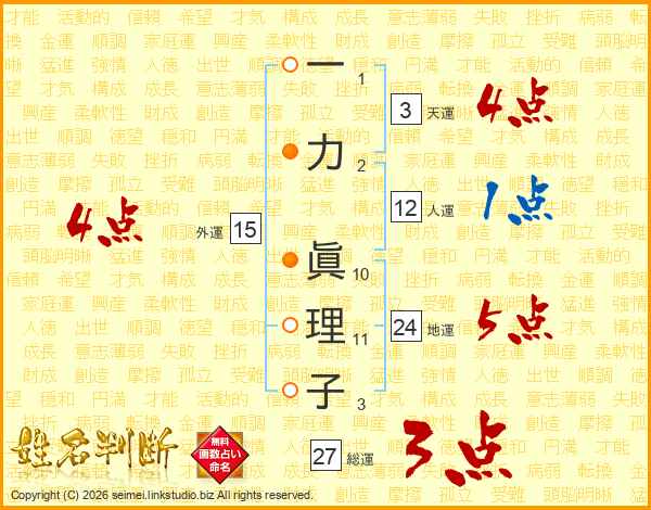 一(1画)力(2画) 眞(10画)理(11画)子(3画)