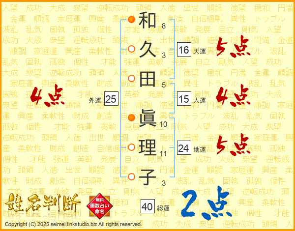 生活面を象徴する運勢です。外部から受ける影響力を表し、結婚運、家庭運や職場、環境への順応性を表します。総運から人運を引いた画数。姓や名が1文字の場合を除く。