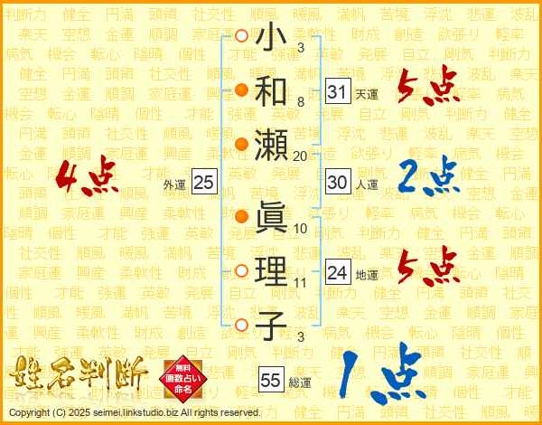 小(3画)和(8画)瀬(20画) 眞(10画)理(11画)子(3画)