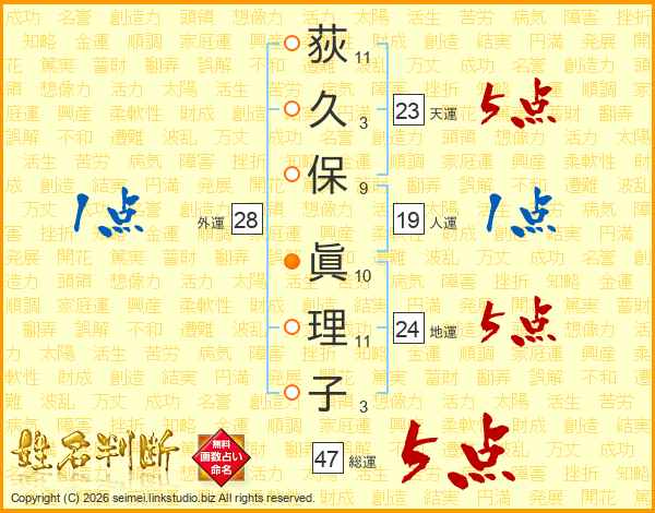 荻(11画)久(3画)保(9画) 眞(10画)理(11画)子(3画)