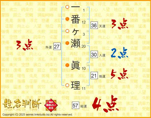 一番ヶ瀬眞理さんの総運は57画の4点!