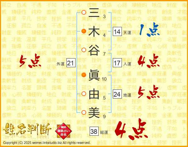 三(3画)木(4画)谷(7画) 眞(10画)由(5画)美(9画)