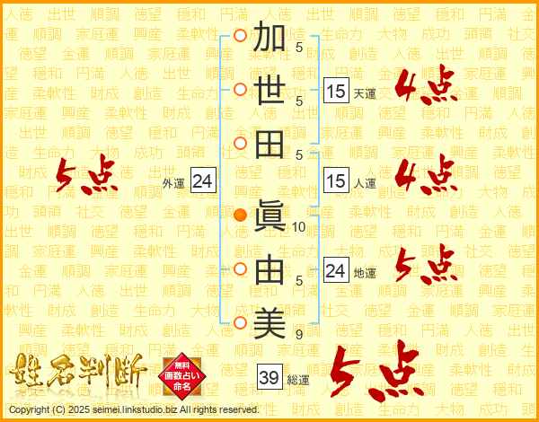 加世田眞由美さんの総運は39画の5点!