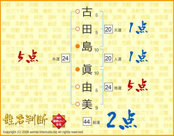 古(5画)田(5画)島(10画) 眞(10画)由(5画)美(9画)