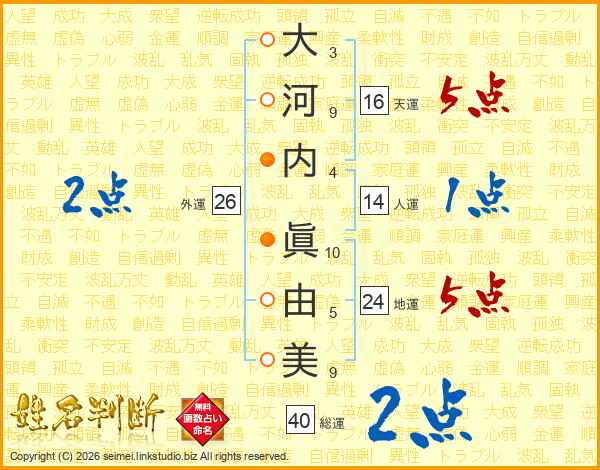 大(3画)河(9画)内(4画) 眞(10画)由(5画)美(9画)