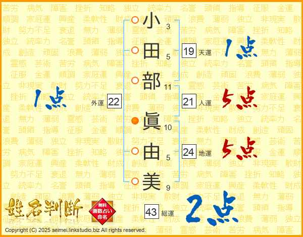 小(3画)田(5画)部(11画) 眞(10画)由(5画)美(9画)