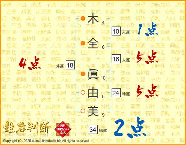 木(4画)全(6画) 眞(10画)由(5画)美(9画)