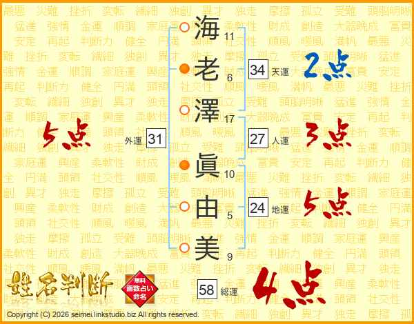 海(11画)老(6画)澤(17画) 眞(10画)由(5画)美(9画)