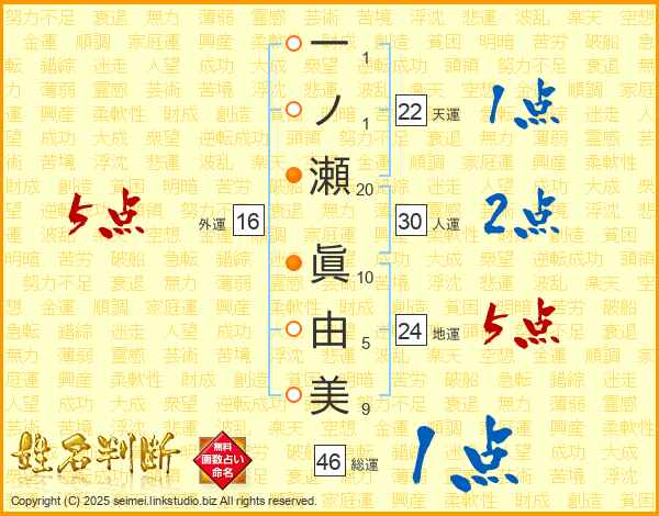 一(1画)ノ(1画)瀬(20画) 眞(10画)由(5画)美(9画)