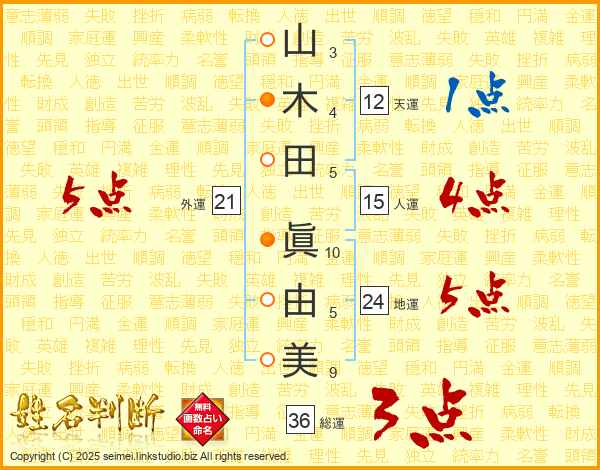 山(3画)木(4画)田(5画) 眞(10画)由(5画)美(9画)
