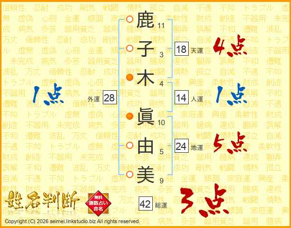 鹿(11画)子(3画)木(4画) 眞(10画)由(5画)美(9画)