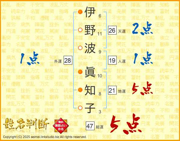 伊(6画)野(11画)波(9画) 眞(10画)知(8画)子(3画)