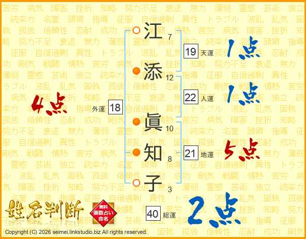 江(7画)添(12画) 眞(10画)知(8画)子(3画)