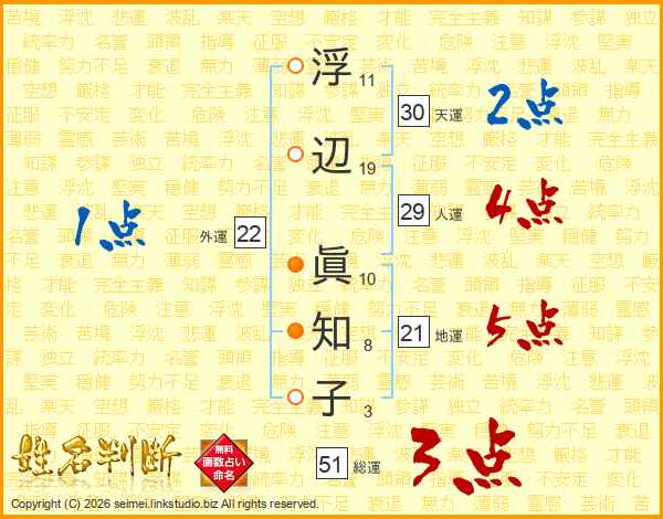 浮(11画)辺(19画) 眞(10画)知(8画)子(3画)