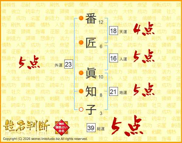 番(12画)匠(6画) 眞(10画)知(8画)子(3画)
