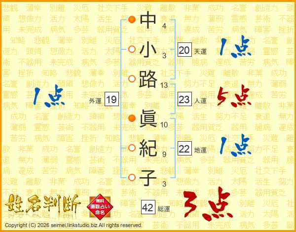 中(4画)小(3画)路(13画) 眞(10画)紀(9画)子(3画)