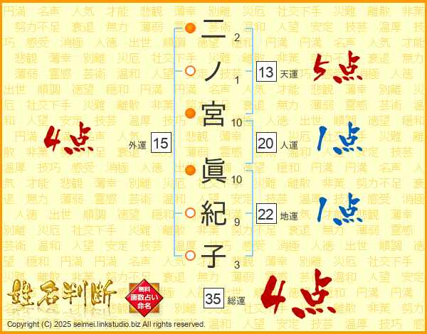 二(2画)ノ(1画)宮(10画) 眞(10画)紀(9画)子(3画)