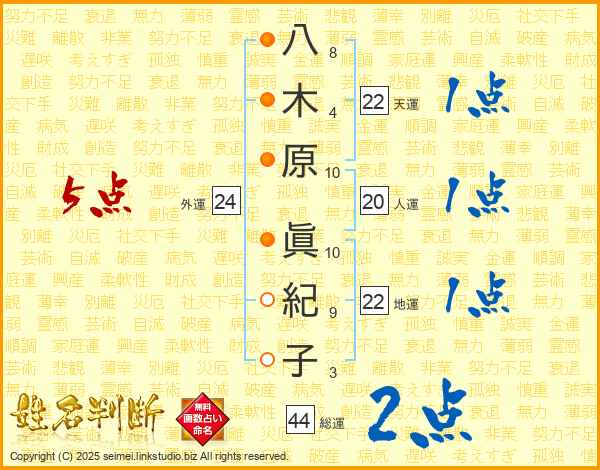 八(8画)木(4画)原(10画) 眞(10画)紀(9画)子(3画)