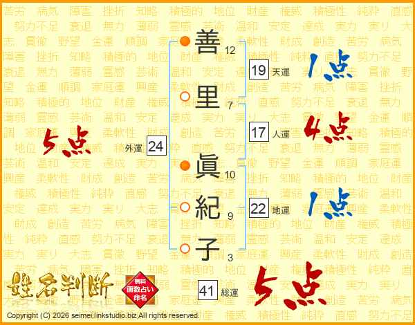 善(12画)里(7画) 眞(10画)紀(9画)子(3画)